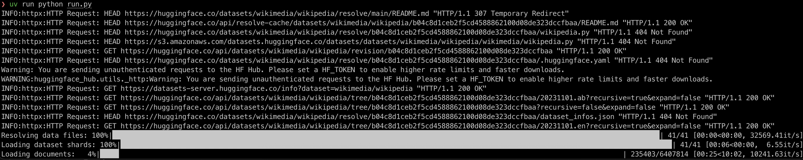 The first run will download the Wikipedia dataset from Hugging Face (±20GB, cached after that). If you want faster downloads, you can set a Hugging Face token: